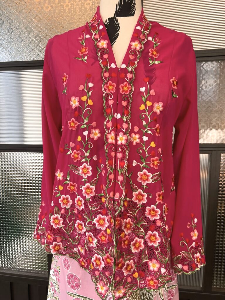 Disulam dengan bunga rawang buatan tangan, setiap helaian benang dijahit terus pada kain untuk menghasilkan corak halus, unik, dan penuh ketelitian.