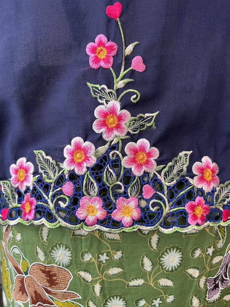 Disulam dengan bunga rawang buatan tangan, setiap helaian benang dijahit terus pada kain untuk menghasilkan corak halus, unik, dan penuh ketelitian.