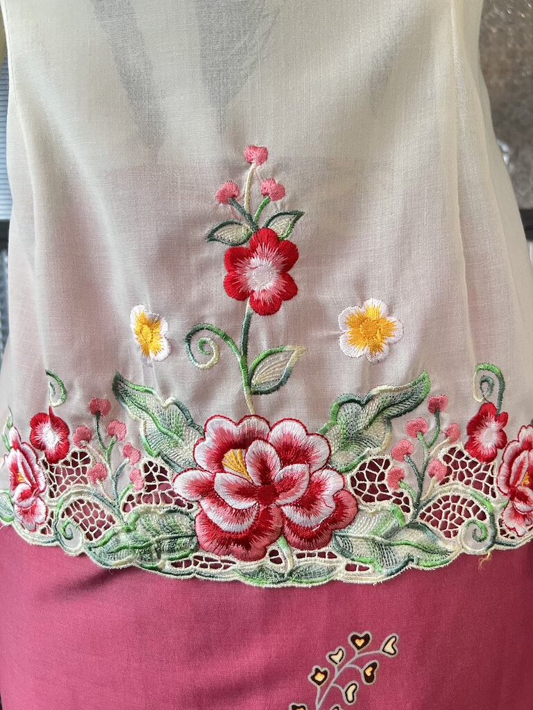 Disulam dengan bunga rawang buatan tangan, setiap helaian benang dijahit terus pada kain untuk menghasilkan corak halus, unik, dan penuh ketelitian.