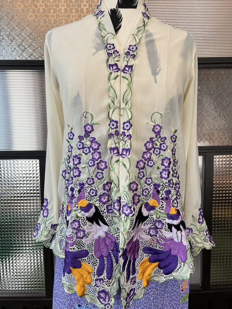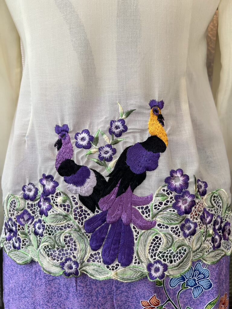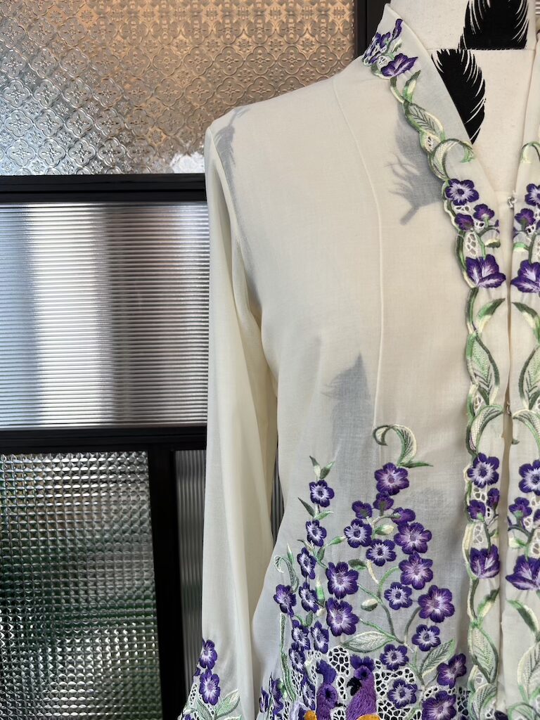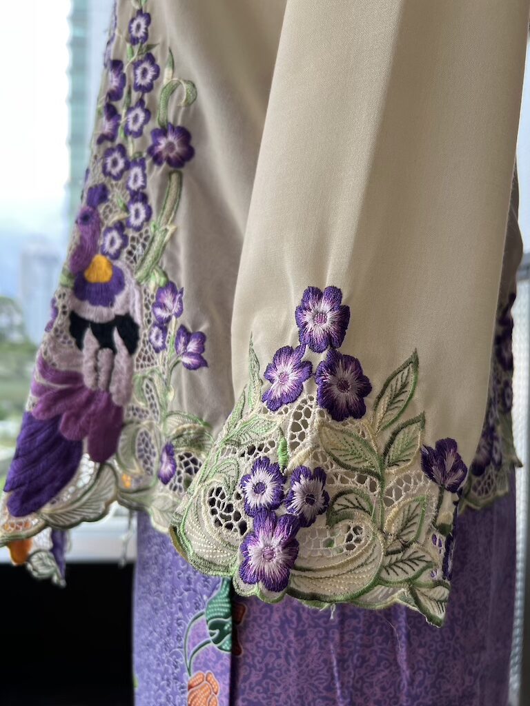 Disulam dengan bunga rawang buatan tangan, setiap helaian benang dijahit terus pada kain untuk menghasilkan corak halus, unik, dan penuh ketelitian.