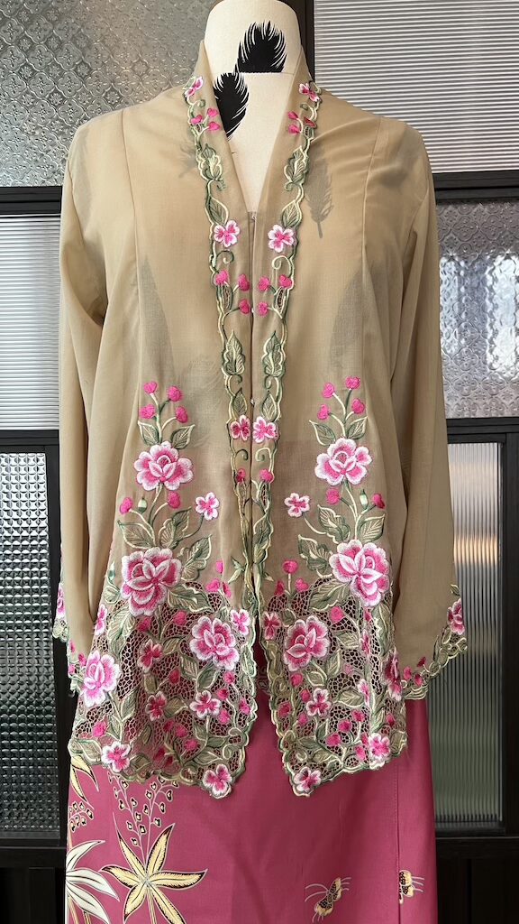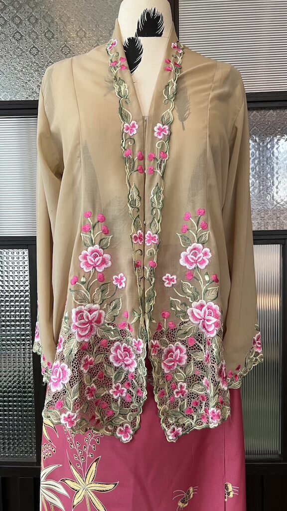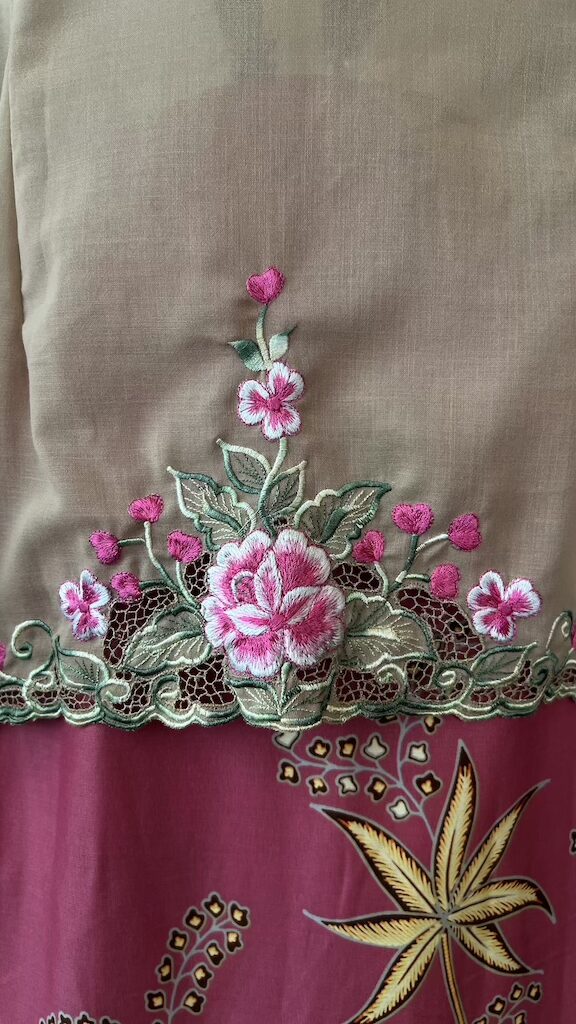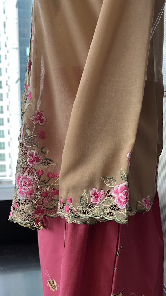 Disulam dengan bunga rawang buatan tangan, setiap helaian benang dijahit terus pada kain untuk menghasilkan corak halus, unik, dan penuh ketelitian.