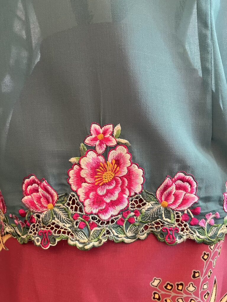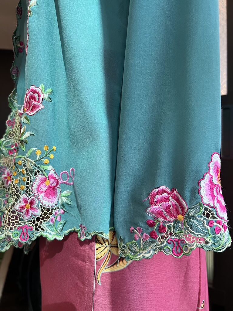 Disulam dengan bunga rawang buatan tangan, setiap helaian benang dijahit terus pada kain untuk menghasilkan corak halus, unik, dan penuh ketelitian.